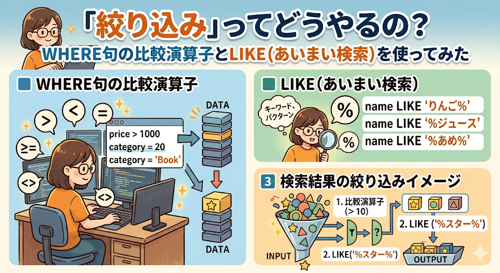 前回の記事では、データベースからデータを取り出す「SELECT文」の基本をお伝えしました。今回はその続き——条件を使ってもっと細かく絞り込む方法を解説します!